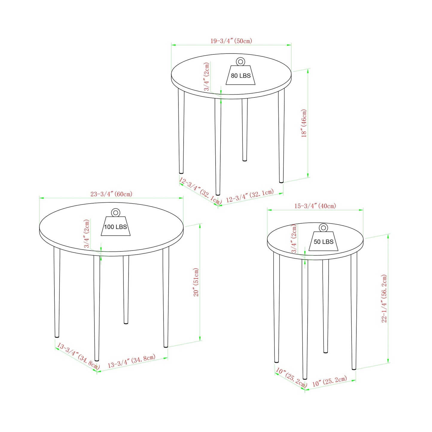 - Shortest Table: 18" H x 19.6" L x 19.6" W