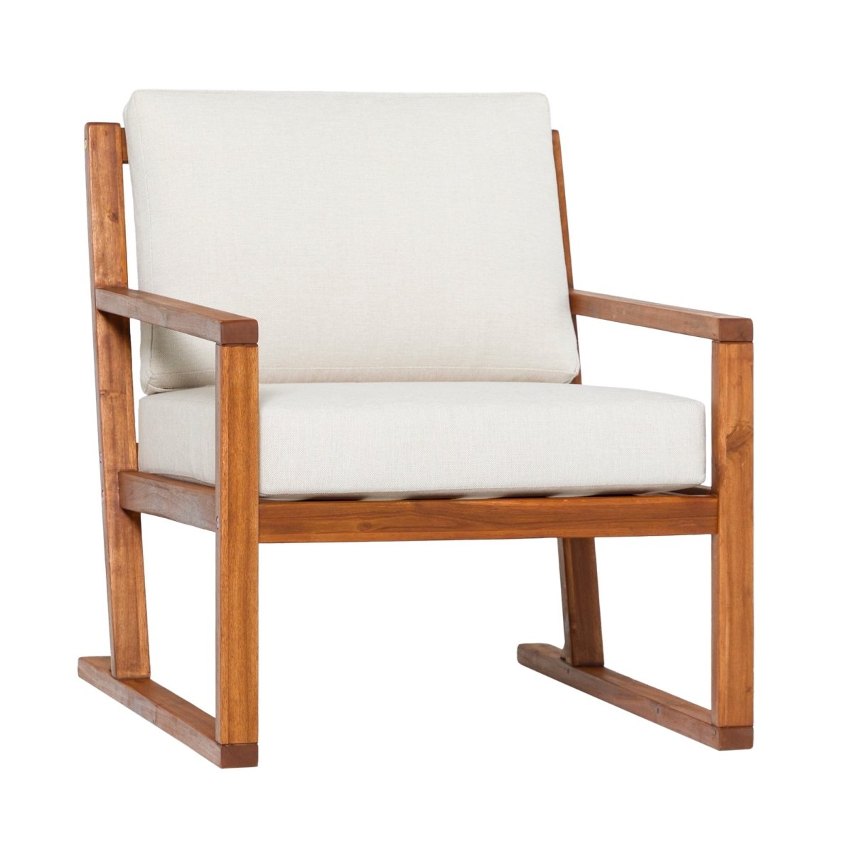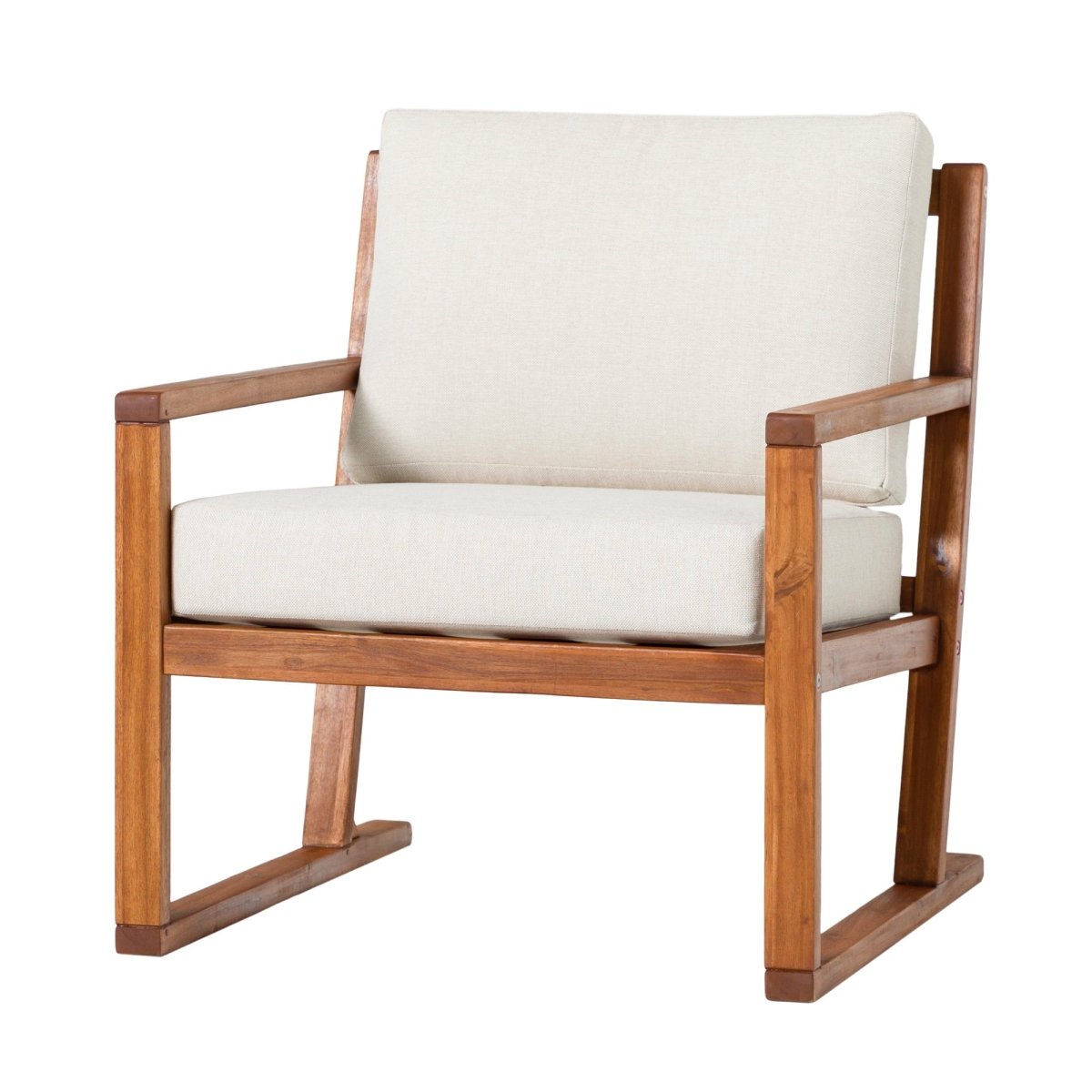 Sleek, simple, and oh-so-stylish, this outdoor accent chair is just what you need to craft a patio paradise. With its upholstered olefin cushions, this chair is the perfect perch to curl up and finish your latest read, or sit and sip or chat with friends. A slatted back, angled frame, and curved edges cater to the luxe look and feel that’ll make your backyard or patio your favorite place to be. Whether it’s displayed inside or out, this accent chair will effortlessly upgrade your space.