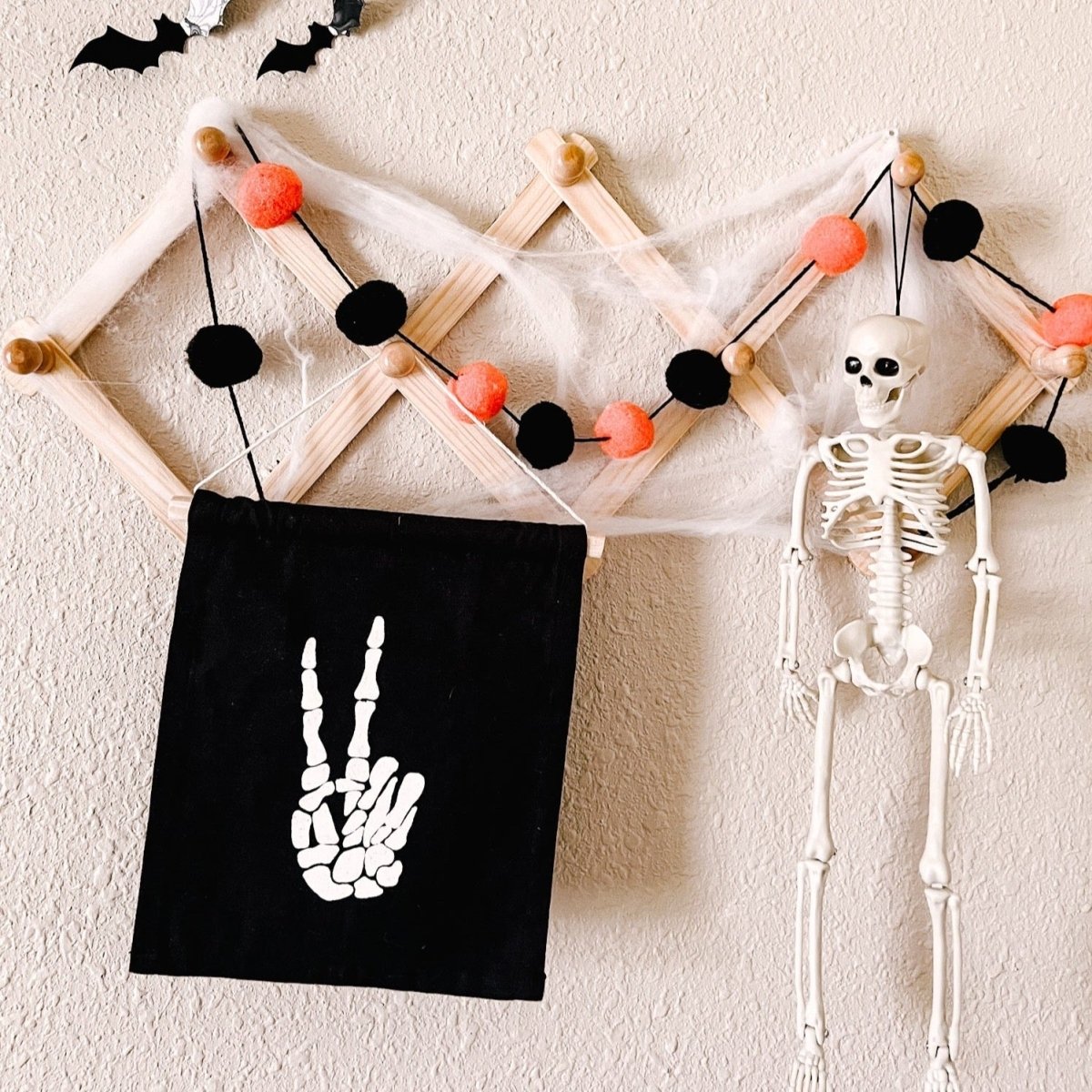 This handmade canvas hang sign features a white skeleton peace sign screen print on black canvas, combining Halloween aesthetics with bohemian style. Measuring 9 inches by 7.5 inches, this wall banner brings unique character to any space while supporting fair trade artisan work.