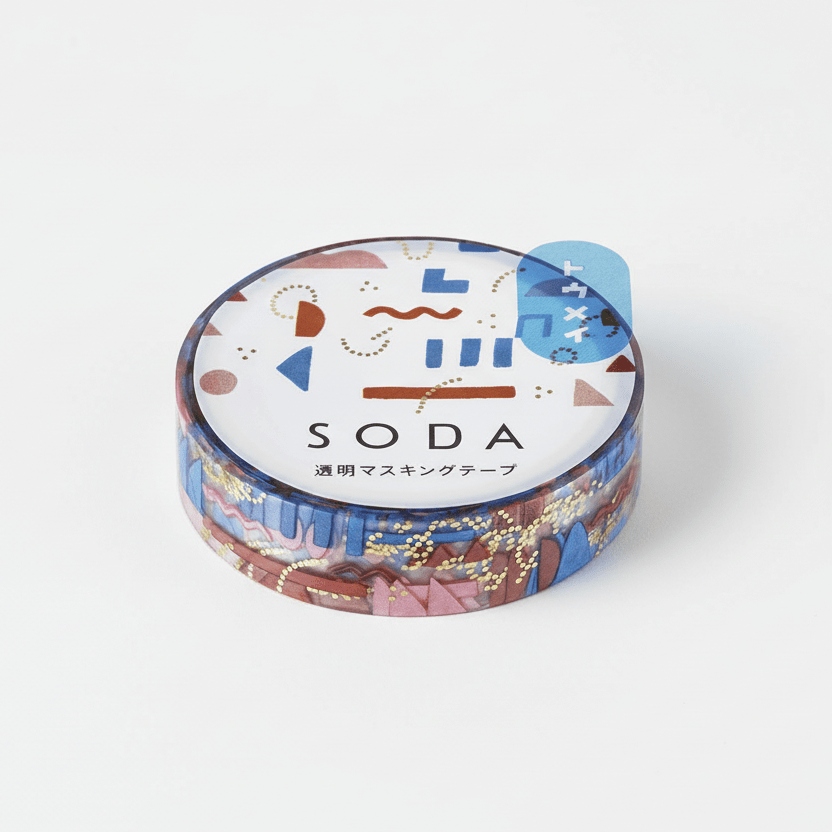 SODA decorative tape features transparent PET film construction with gold foil metallic parts design. The clear base allows patterns to stand out on any background while maintaining visibility of the surface beneath. This 0.4" width tape offers repositionable adhesive that sticks firmly yet removes without residue or paper damage.