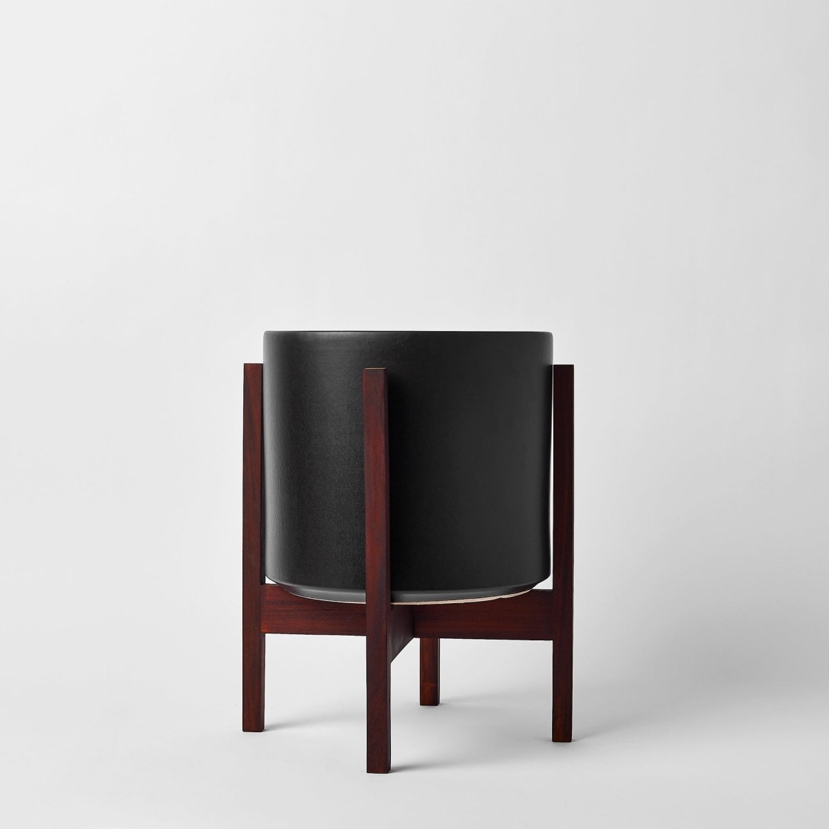 This 10 inch planter includes a reversible mahogany stand that provides three display configurations. Position your plant at full height, place it closer to the ground, or use the stand independently with another planter for grouped arrangements. Crafted by global artisans, this high-fire porcelain ceramic cylinder features full interior and exterior glazing with a matte finish.