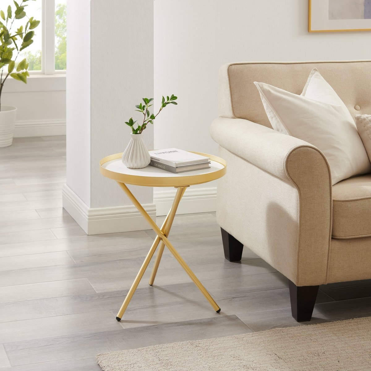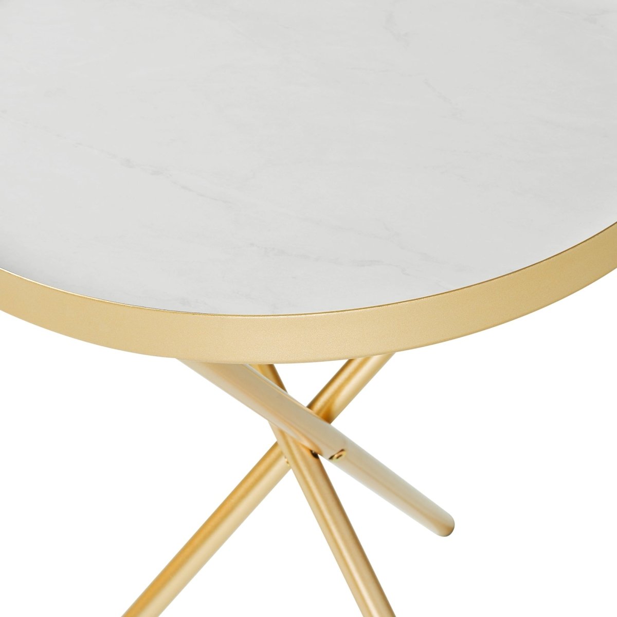 Elegantly enhance your space with this faux marble-top side table. With its high-gloss, melamine tabletop, this accent table is moisture resistant and ready to host your nightcaps and party cocktails, along with your favorite décor. The smooth, sanded metal base lends a luxe look while a simple silhouette boasts contemporary intrigue and a small-space-friendly shape. Whether it’s sitting couch side, in your personal sanctuary, or accenting your home office, this versatile piece is an effortless ode to your great style.