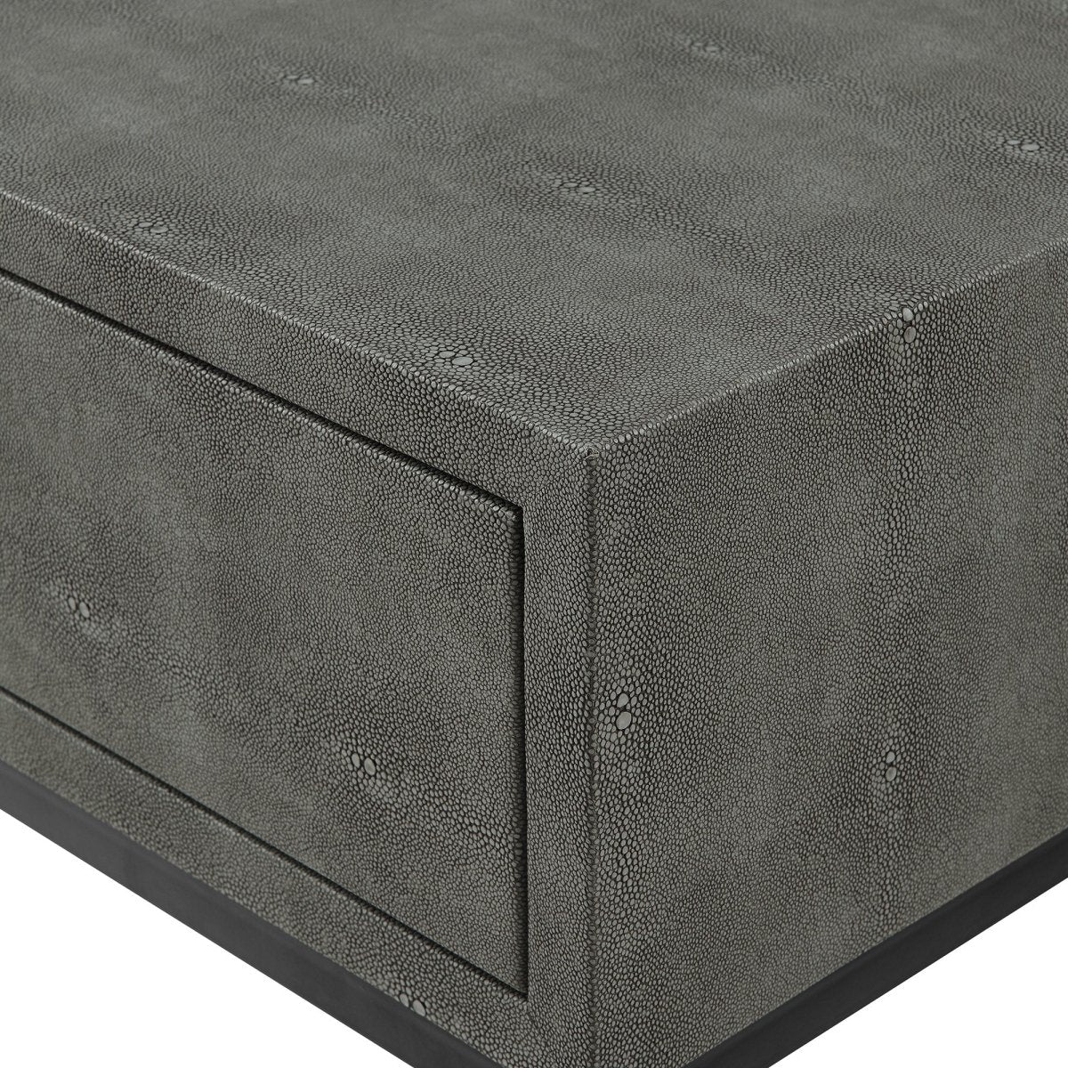 The textured faux shagreen surface creates tactile appeal and visual depth. Diagonal metal accents provide geometric contrast against the organic texture. Cutout handles maintain clean lines while ensuring functional drawer access. This combination of materials and finishes supports modern glam, contemporary, and transitional interior styles.