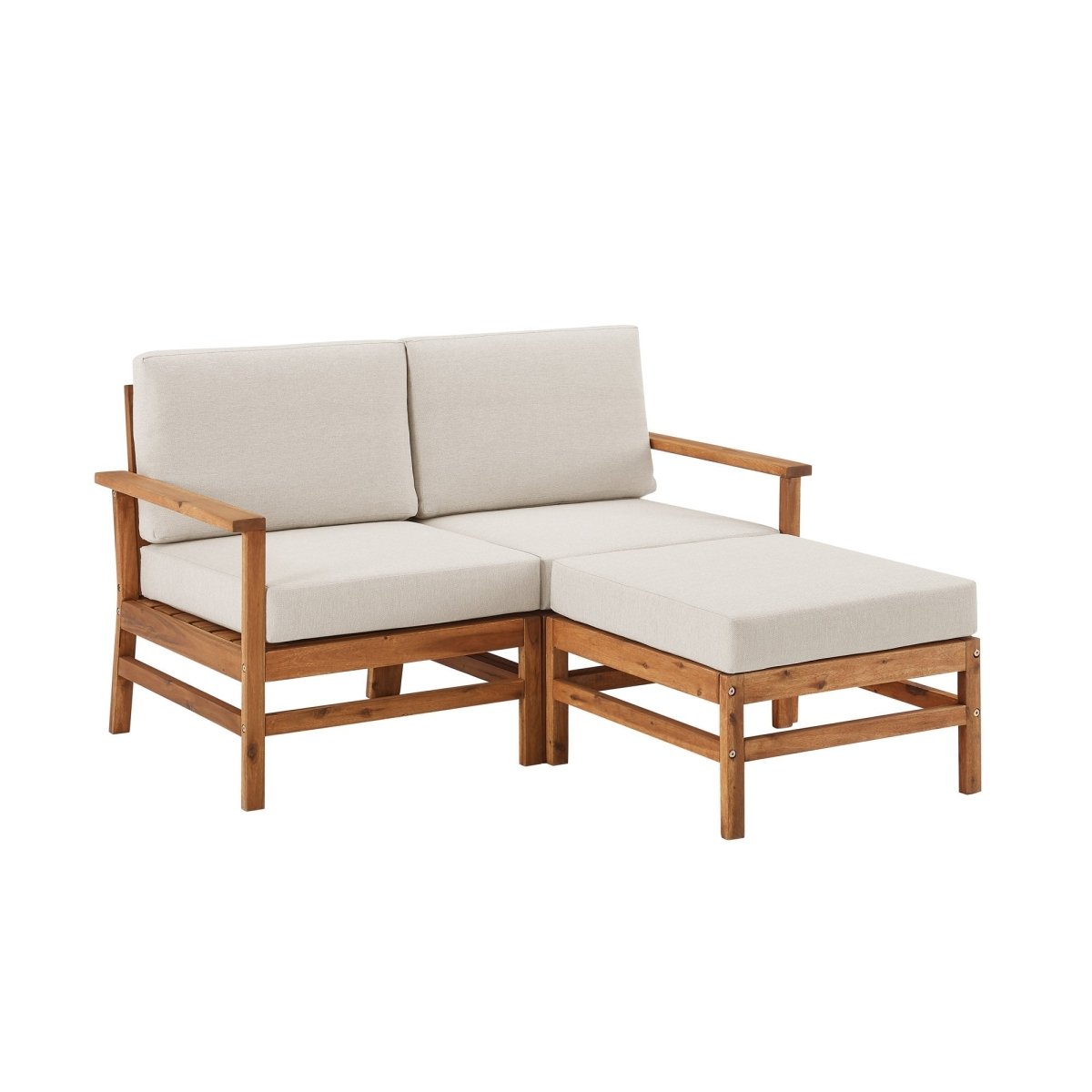 The simple yet trend-setting silhouette of this trio will set your space apart, whether it’s sitting by the pool, around the fire pit, or on your apartment balcony. Sleek and sustainable solid acacia wood frames make up a sturdy, long-wearing base, and upholstered cushioned and backrests top off this set with a comfy place to sit and chat for hours. Kick up your feet on the included cushioned ottoman and sit solo, or use it as an extra seat so you can gather ‘round and offer enough seating for your favorite people or even furry friends.