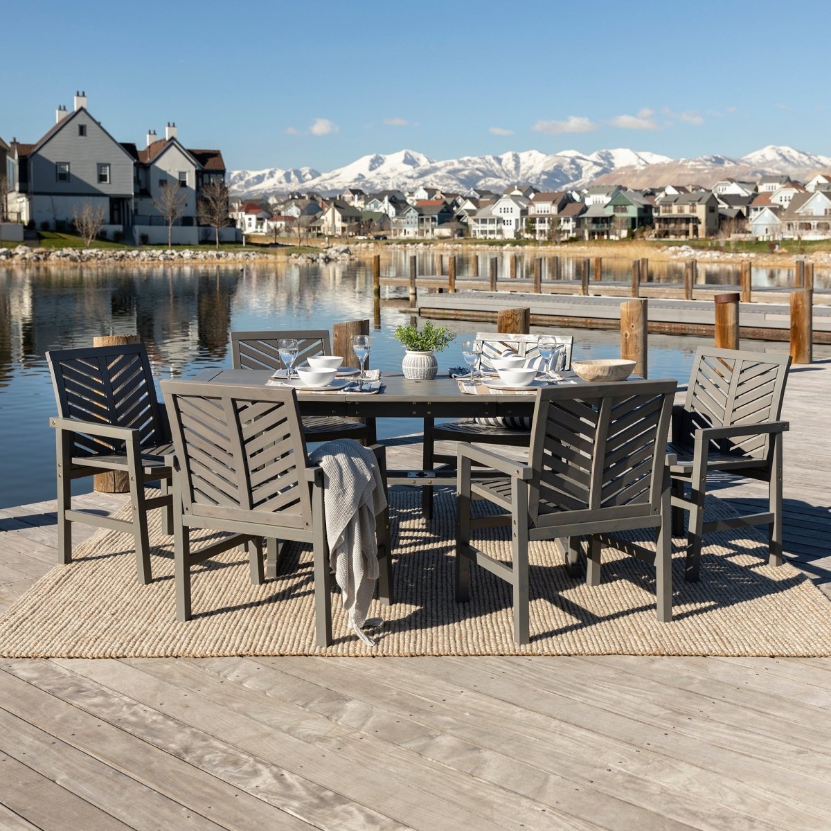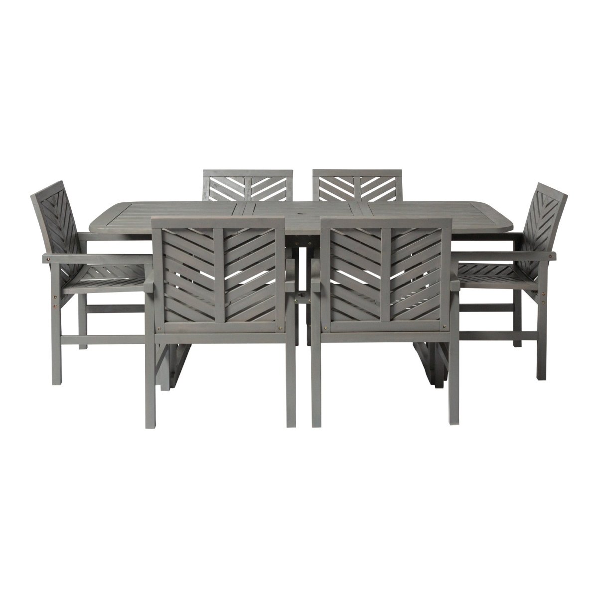 Rain or shine you’ll want to gather around this good-looking, sturdy 7-piece outdoor dining set. The six comfortable patio chairs feature chevron detailing for a fun and modern spin on the classic outdoor dining set. The patio table includes a butterfly extension and can accommodate an outdoor umbrell at its center. This modern backyard living set will have you feeling fancy and fresh even when someone lets the barbeque dinner cook a little too long.