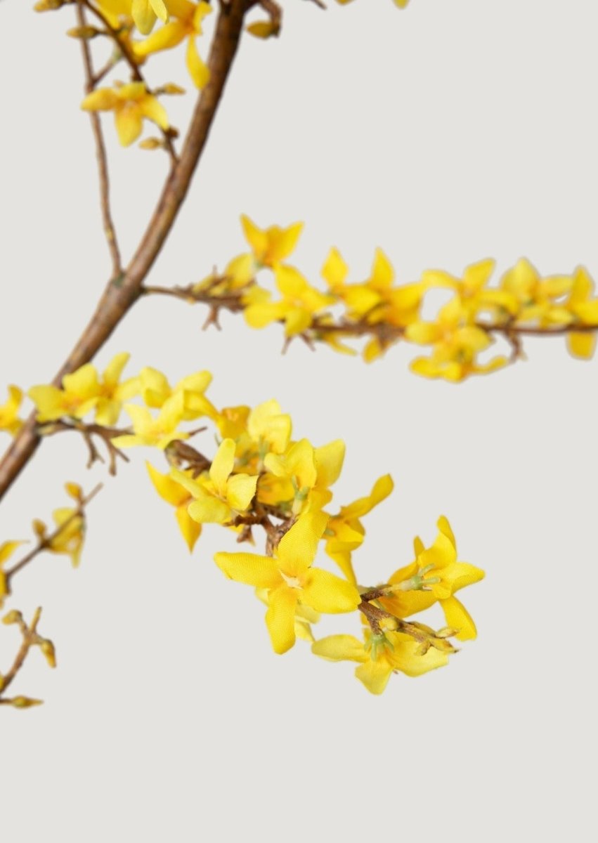 The flowering portion measures 22 inches tall by 8 inches wide, featuring individual blooms that range from 1 to 1.5 inches wide. Each bloom is crafted from polyester and plastic materials to replicate the delicate appearance of natural forsythia flowers. The substantial height makes this branch ideal for statement arrangements that command attention in entryways, living rooms, and dining spaces.