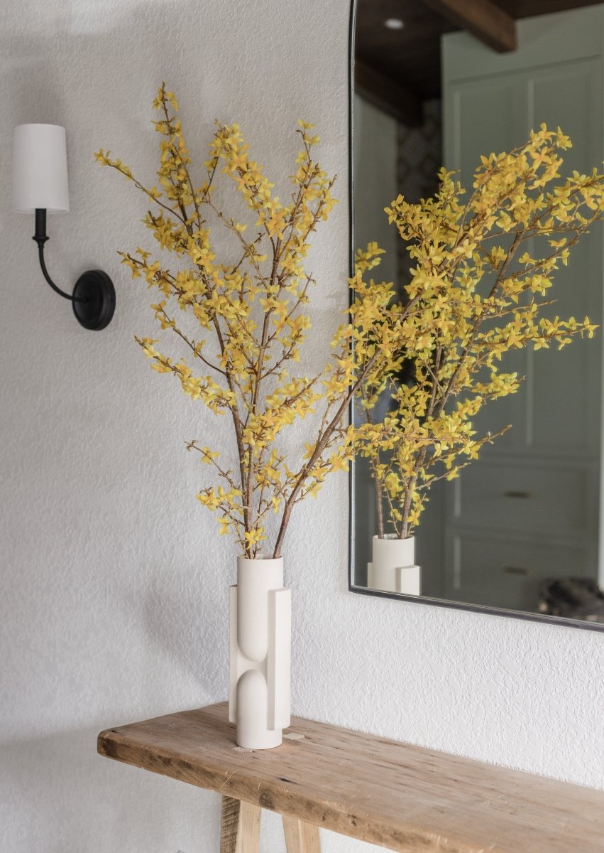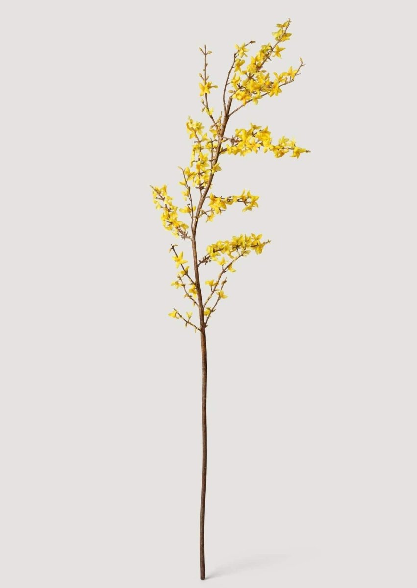 Use these forsythia branches to add height variation to console tables, mantels, or floor arrangements. The spring-flowering aesthetic brings warmth and energy to interior spaces during any season, making them especially popular during late winter and early spring when homeowners crave botanical elements.