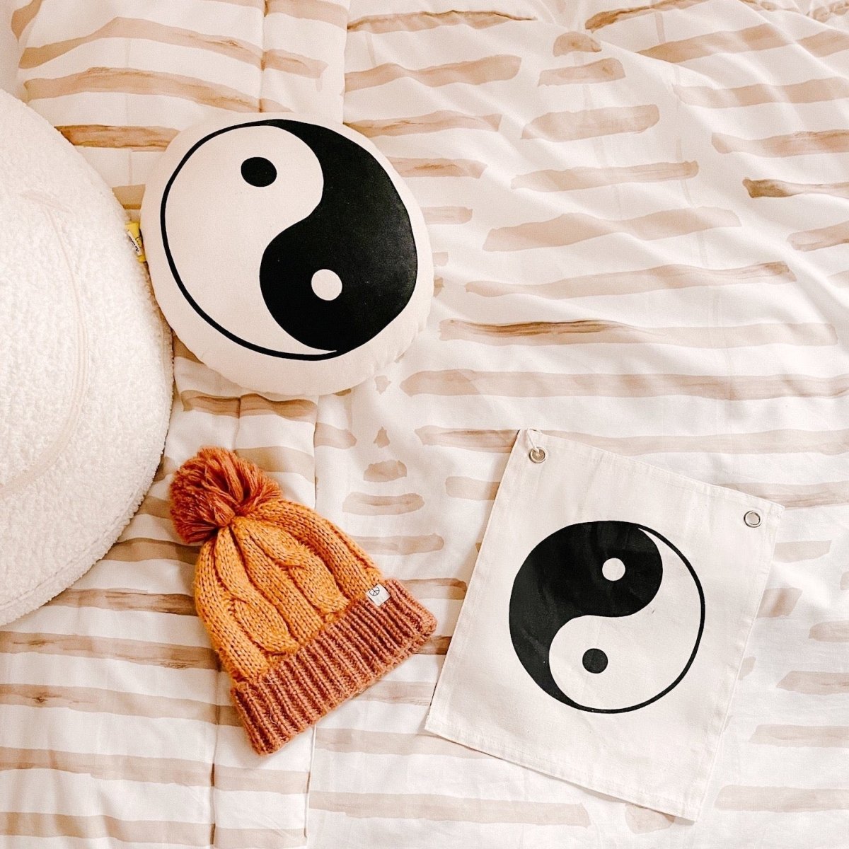 The classic yin yang symbol is rendered in black screen print against the natural canvas backdrop, creating a minimalist aesthetic that complements bohemian, meditation, and modern interior styles. The 10x12 inch size makes it ideal for smaller wall spaces, dorm rooms, apartments, or as part of a gallery wall arrangement.